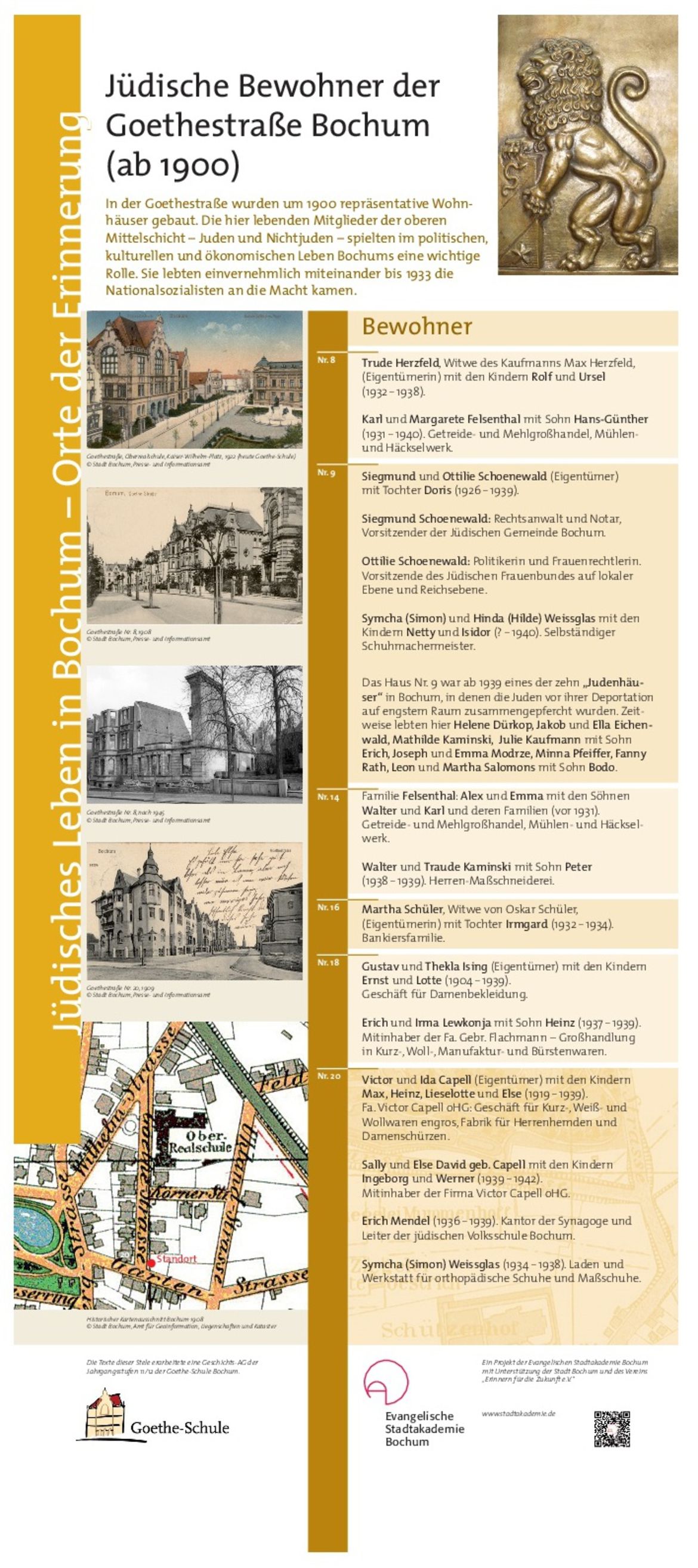 Die Stele erinnert an die jüdischen Bewohnerinnen und Bewohner der Goethestraße ab 1900 (in Auswahl) und deren Verdienste für die Stadt Bochum in einem friedlichen Miteinander bis 1933 die Nationalsozialisten an die Macht kamen.